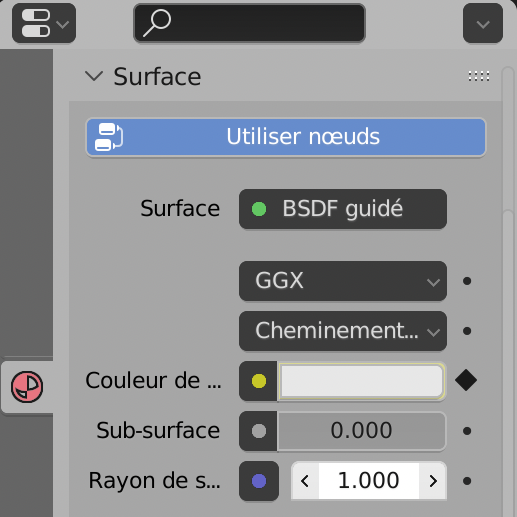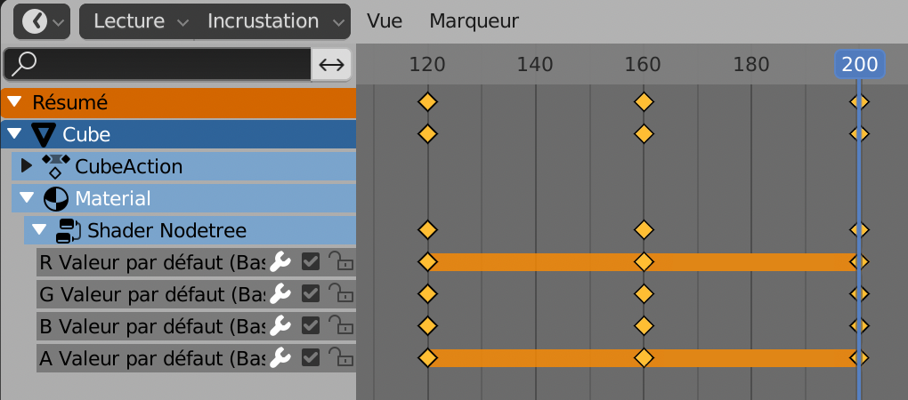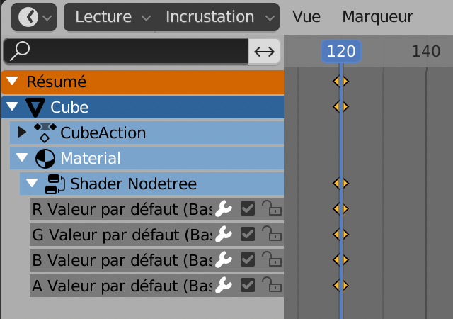 De nombreuses Propriétés peuvent être animées de la sorte dans Blender. Il suffit de voir un petit point noir à droite d’une case de réglage pour savoir que cette propriété peut être animée. Nous allons ainsi changer la couleur du Cube.
