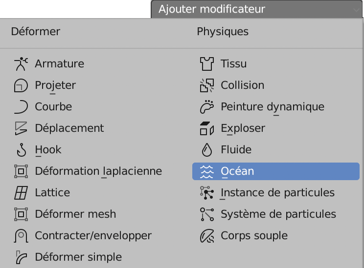 Sélectionner le Cube. Dans les Propriétés Modificateurs (icône bleue clé à molette), Ajouter Modificateur > Océan.