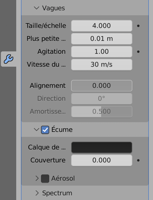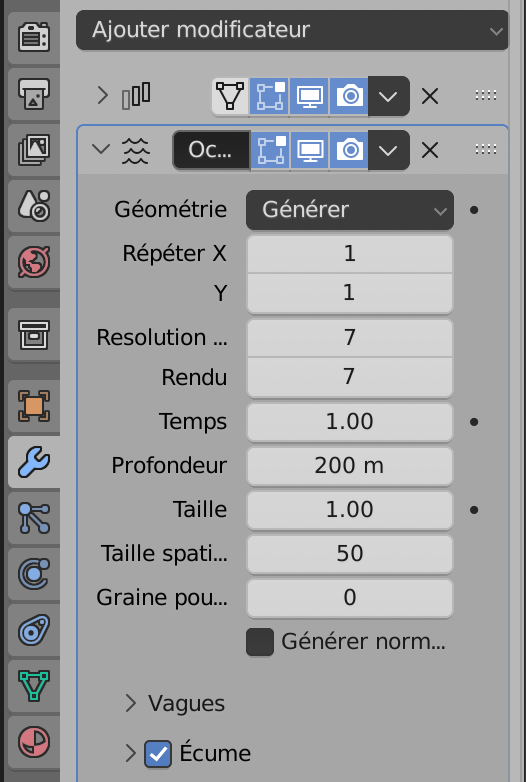 Les dimensions de l’océan peuvent être modifiées en clonant la tuile de base en X ou Y (Répéter) ou en changeant la valeur de Taille spatiale, réglée sur 50m par défaut.