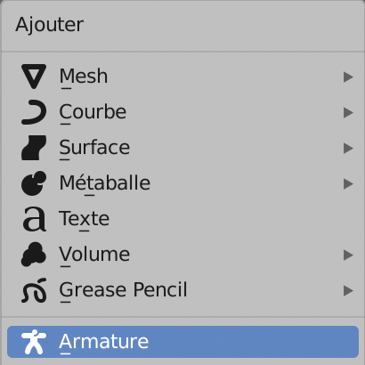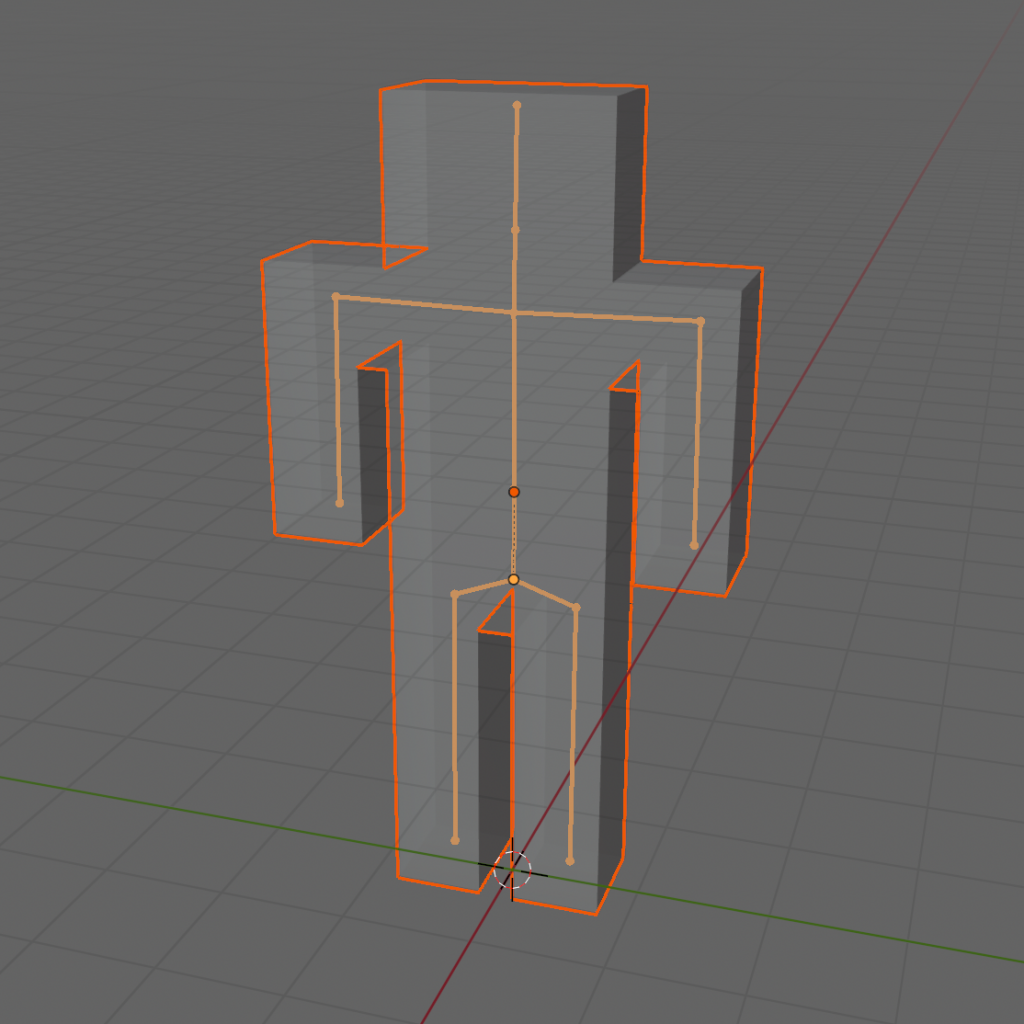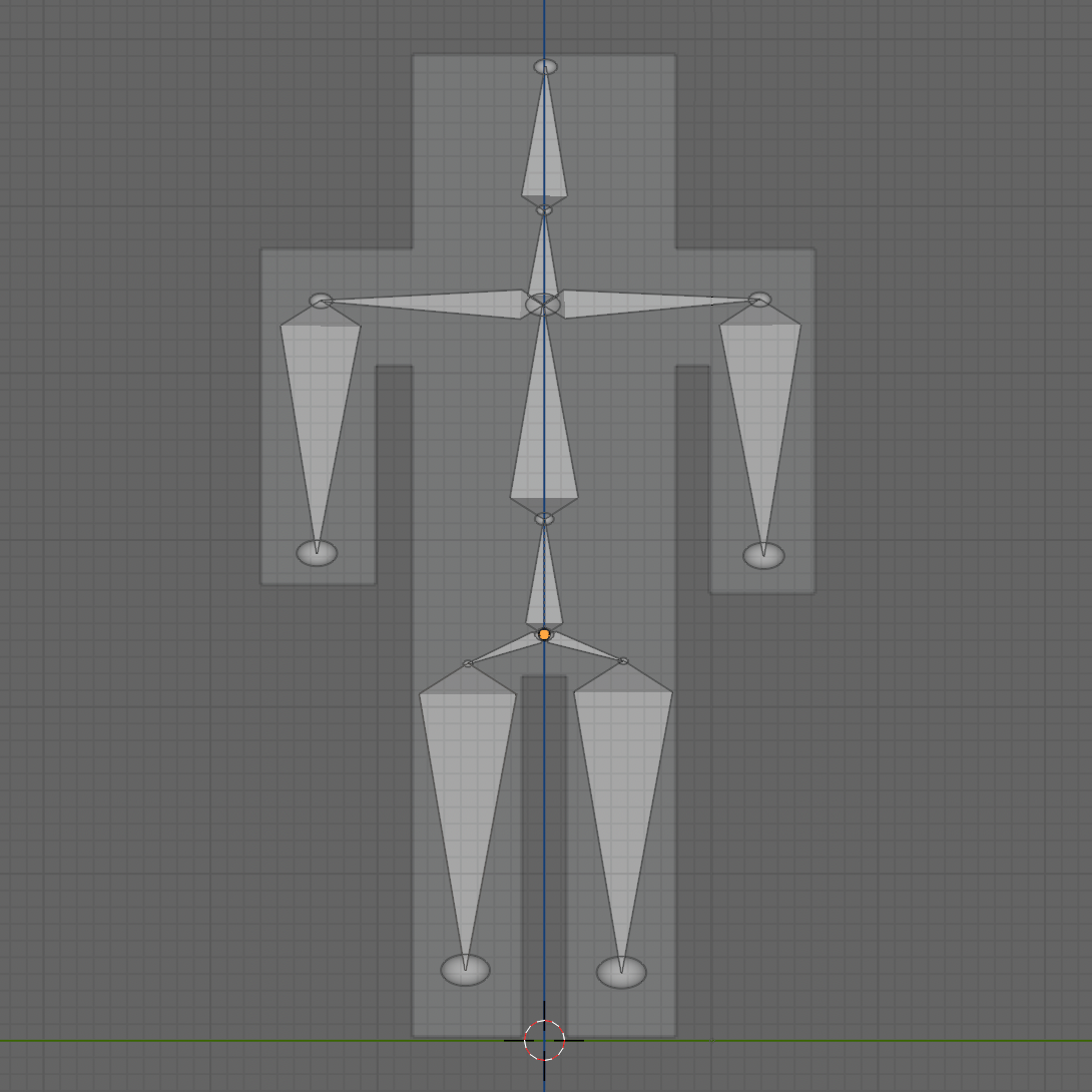 Revenir en Mode Objet (TAB), passer en Vue de Face (Gizmo X) et activer l’affichage Rayons X pour voir à travers le corps (Alt Z). Ajouter une Armature (Shift A).