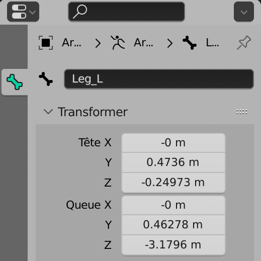 Sélectionner par exemple l’os de la jambe gauche et dans les Propriétés d’Os (icône d’Os en vert), donner un nom dans la première case sombre en haut des réglages. Il faut nommer les os selon une logique déterminée. Donner le nom (Leg pour jambe et L pour le côté, séparés par un point ou un underscore comme ci-dessous).