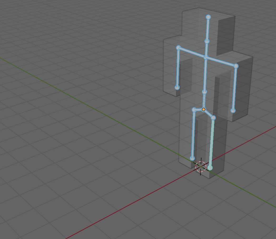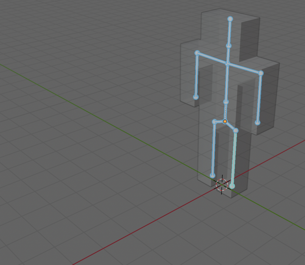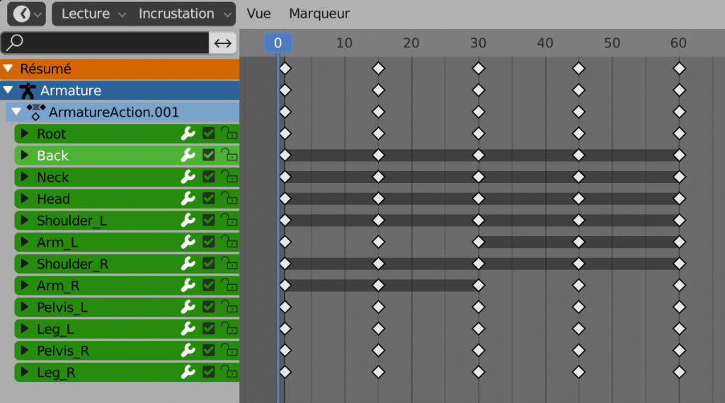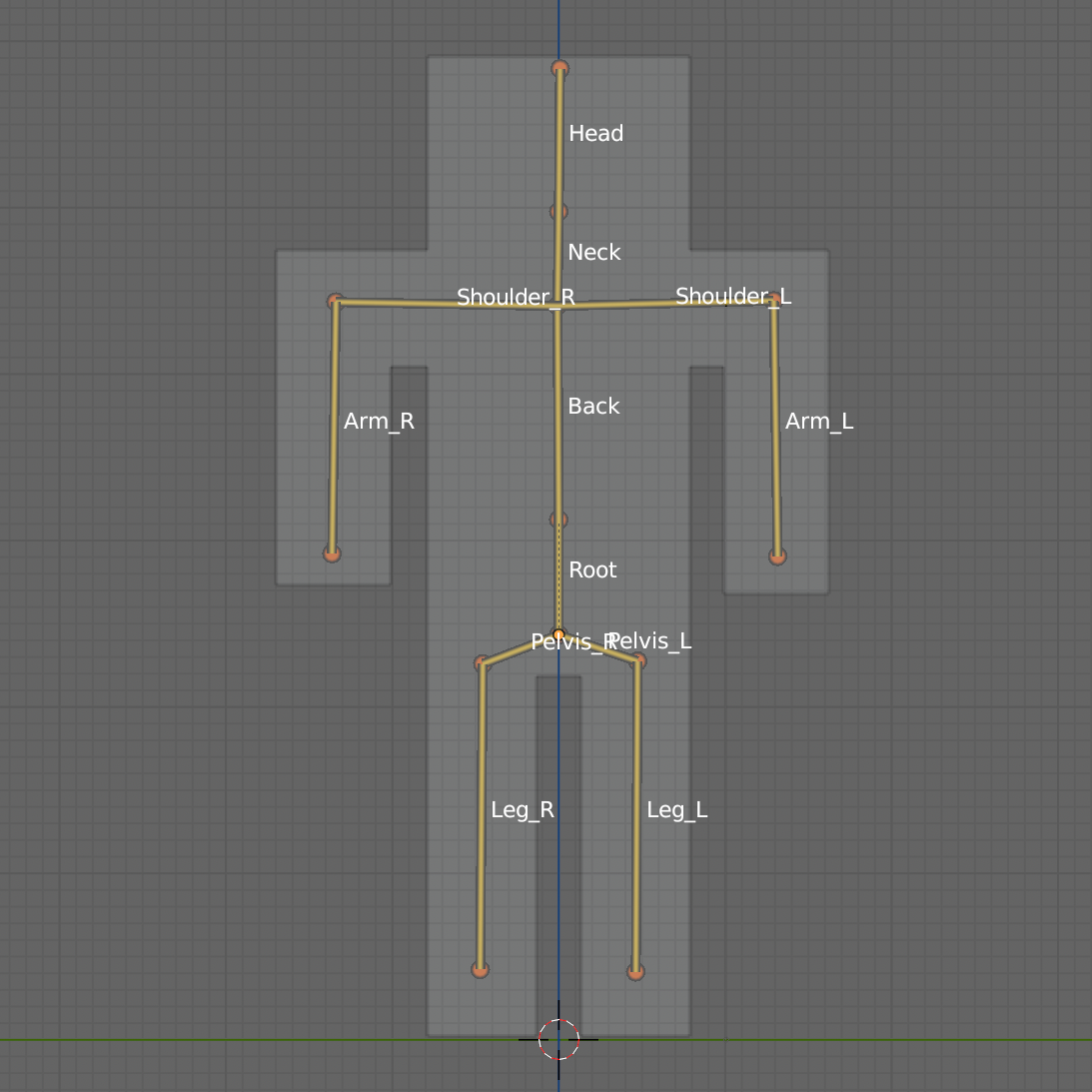 Faire de même pour tous les os : Leg (jambe), Pelvis (bassin), Root (le premier os créé dont dépendent les autres) , Back (dos), Shoulder (Épaule), Neck (Cou), Head (Tête), Arm (Bras), etc.