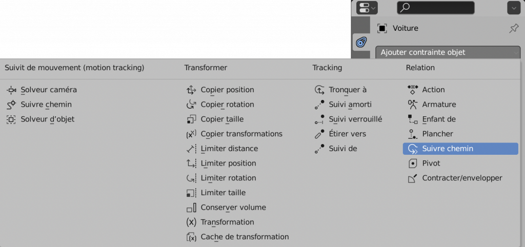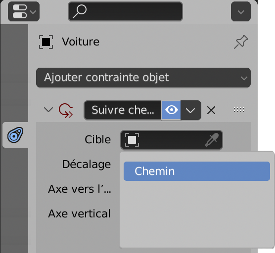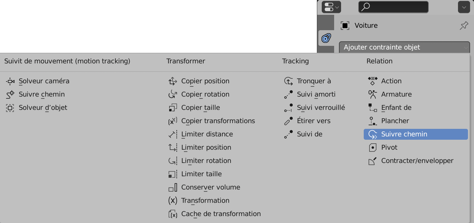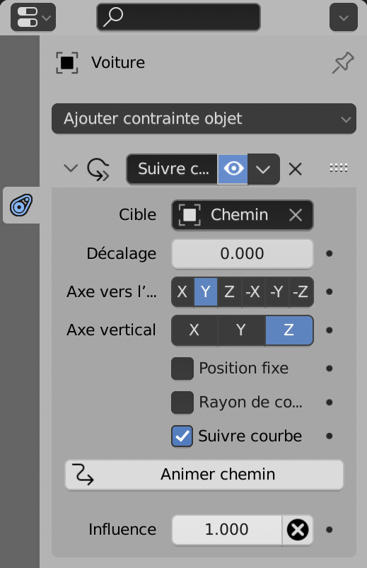 Sélectionner la Voiture. Dans les Propriétés, Onglet Contraintes (icône bleue en forme de poulie) Ajouter une contrainte de type Suivre un Chemin.
