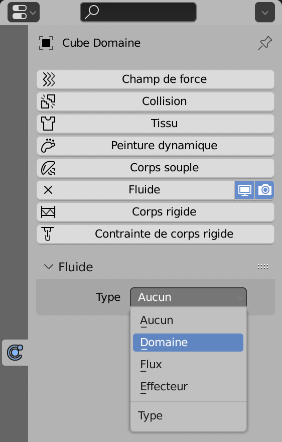 Sélectionner le Cube et dans les propriétés de la Physique, cliquer sur Fluide. Dans les Propriétés de Fluide, choisir Menu Type > Domaine. Le Cube est désigné comme Domaine. Il fixe ainsi les limites physiques de la zone d’écoulement de l’eau (ou autre fluide).
