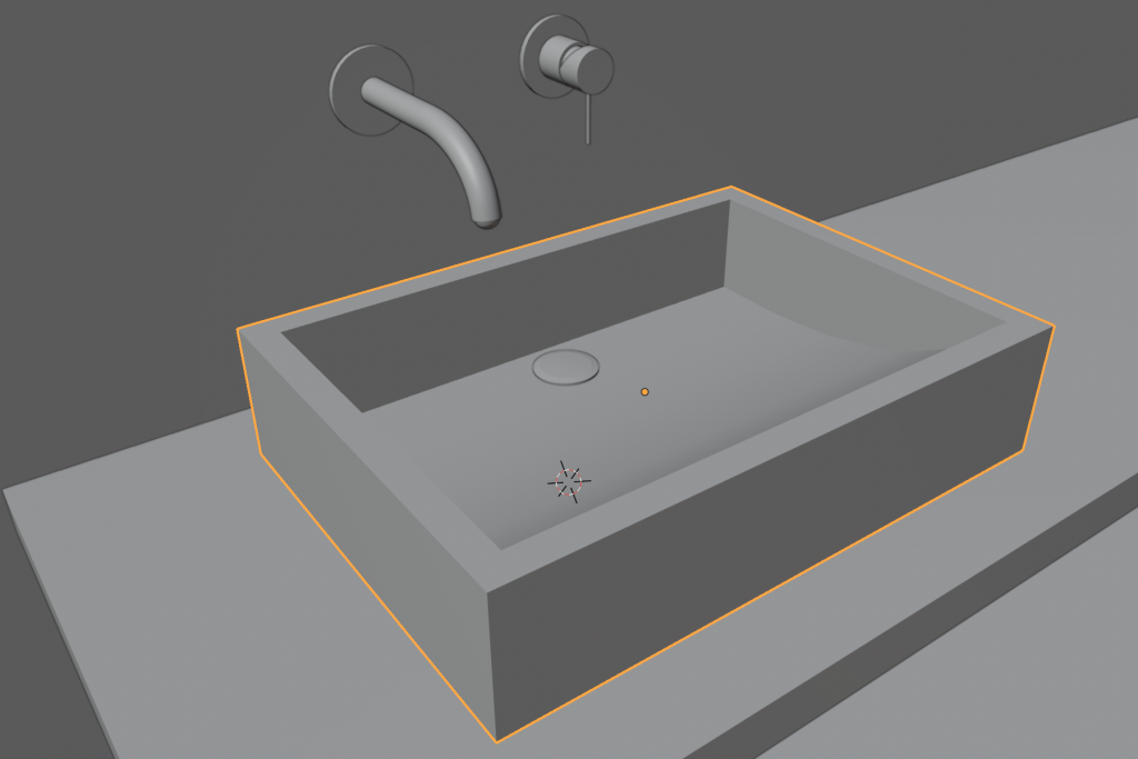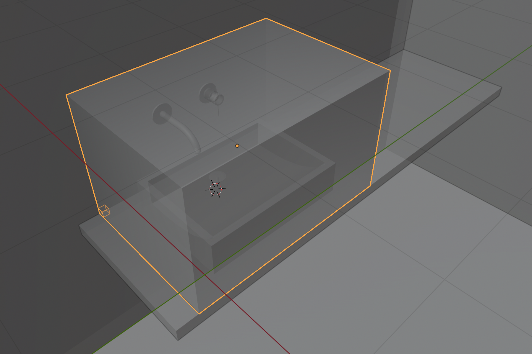 Ajouter un Cube et ajuster ses dimensions de sorte qu’il contienne le lavabo et le robinet. Ci-dessous, en affichage Rayons X.