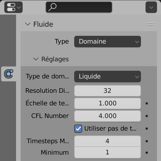 Pus, à droite dans la zone Réglages, choisir Type de Domaine > Liquide. Il sera peut-être nécessaire d’augmenter la valeur de Résolution, par défaut à 32, afin que le petit cube visible dans l’image ci-dessus, en bas à gauche du Cube Domaine, soit plus petit que le Mesh de Flux que nous allons créer juste après, sinon, l’eau ne s’écoulera pas.