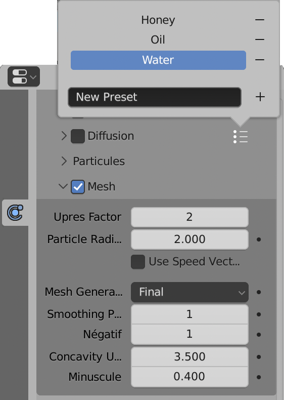 Dans la catégorie de Réglages Liquide, un petit menu permet de choisir un type de liquide préréglé. Choisir Water.