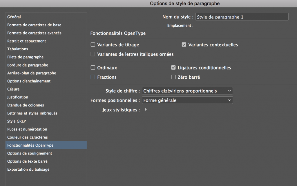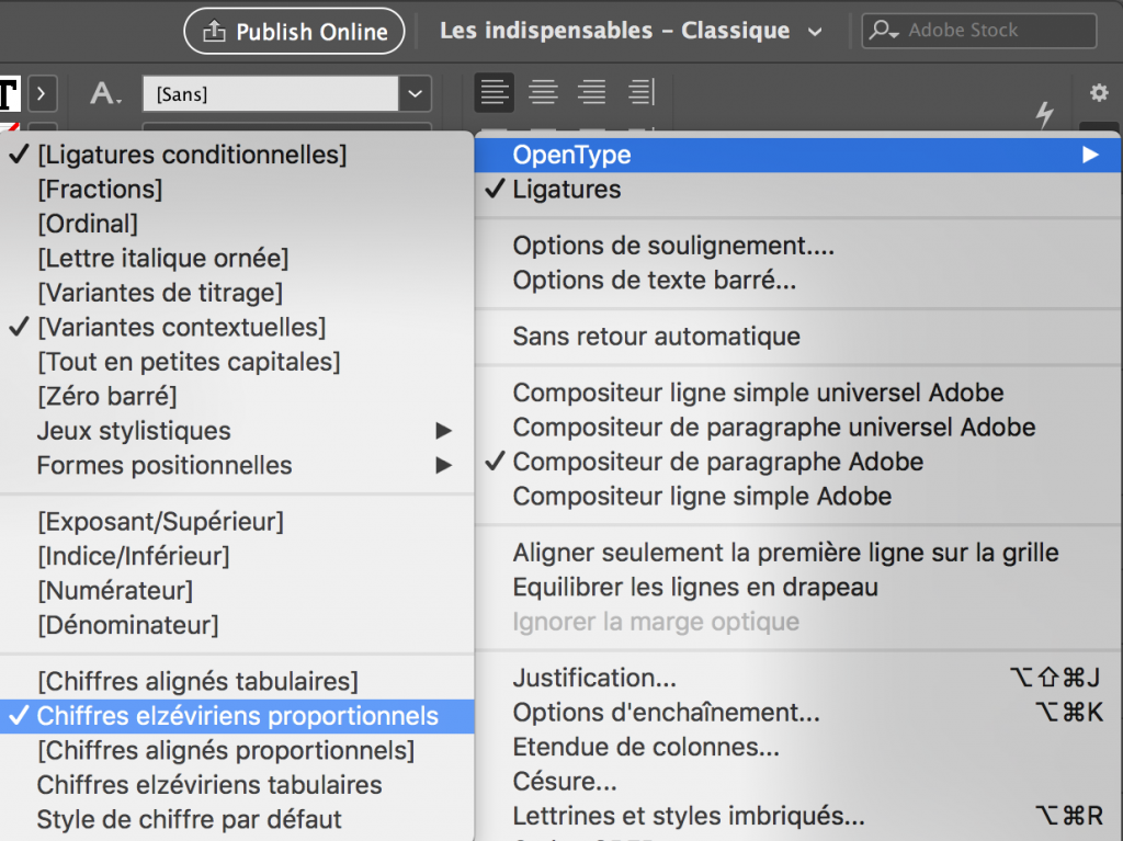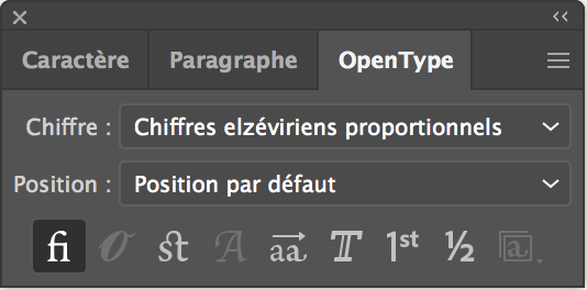 Lorsqu’une fonte comporte des fonctions OpenType, elles ne s’appliquent pas automatiquement. Il faut les activer dans les logiciels, type InDesign ou Illustrator.