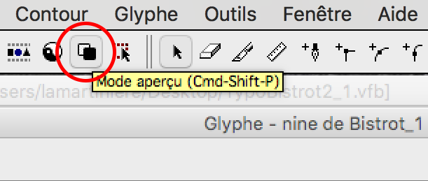 La prévisualisation se fait dans la partie intermédiaire de la fenêtre, à condition que l’affichage des glyphes soit paramétré sur Aperçu (À partir du Menu Affichage > Barres d’outils > Afficher les calques et depuis une fenêtre de Glyphe, cliquer sur le bouton Mode Aperçu).