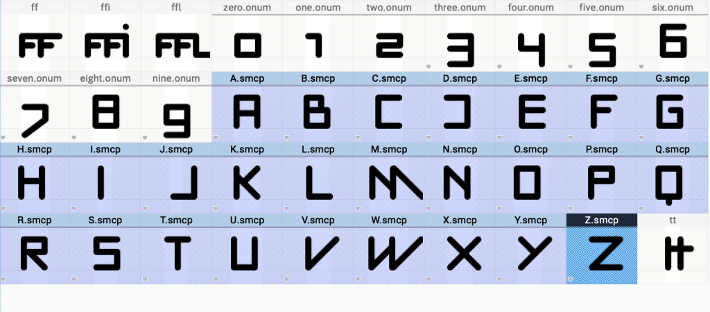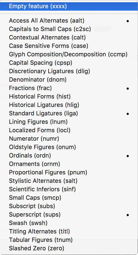 Il faut ensuite associer une fonction OpenType à ces nouveaux glyphes. Toutes les fonctions OpenType ont un nom qui s’écrit avec 4 caractères, bas de casse et chiffres. Par exemple « liga » pour les ligatures, « onum » pour les chiffres elzéviriens (old numbers) ou « smcp » pour les petites capitales (small caps).