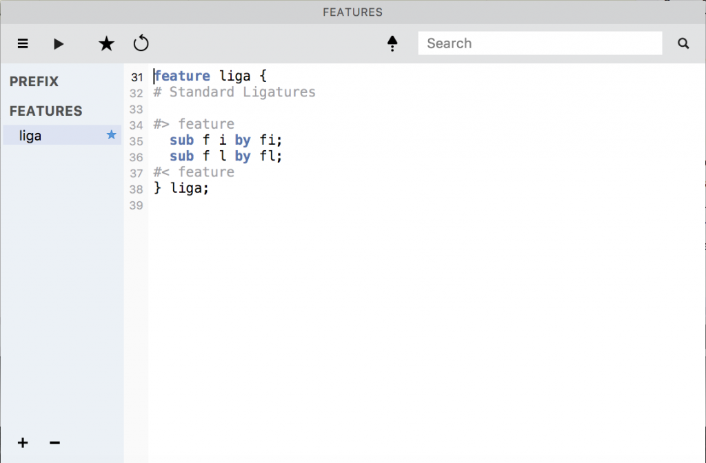 Une nouvelle fonction est créée avec le nom « xxxx ». Dans la partie droite de la fenêtre, un début de code est déjà écrit. Remplacer xxxx par le nom de la fonction souhaitée, au début et à la fin du code, c’est à dire avant et après les accolades. Pour les ligatures utiliser « liga ». Dans la colonne Name, à gauche, le nouveau nom remplace « xxxx » automatiquement.