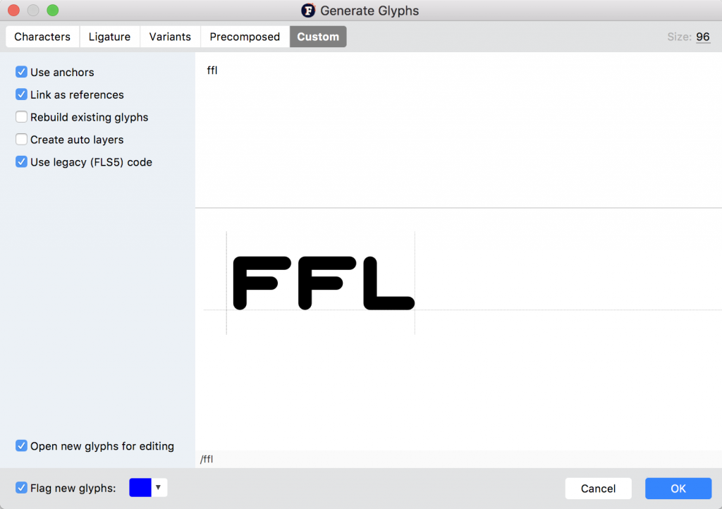 Dans FontLab 7, il est possible de générer ces glyphes très rapidement :