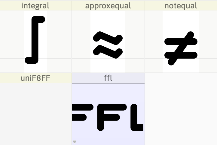 Pour insérer un seul glyphe, par exemple la ligature ffl, dans la zone blanche en haut de la fenêtre, taper le nom du glyphe à créer. Le nom ne doit pas comporter d’espace, ni de ponctuation, ni de signe spécial. Pour une ligature, il est possible dans FontLab 5 d’utiliser des tirets bas dans le nom pour lier les glyphes de base en un seul nouveau glyphe. Le nom de la ligature ffl peut donc être « ffl » ou « f_f_l », mais dans FontLab 7 il ne faut pas utiliser de tirets et le nom sera « ffl ».