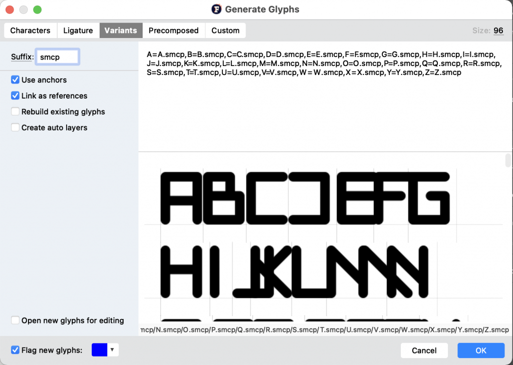 – Dans la fenêtre qui s’ouvre, cliquer sur l’onglet Variants, taper smcp dans la case Suffix et garder cochées les cases Use Anchors et Link as reference. Vous pouvez également garder cochée la case en bas à gauche Flag new glyphs pour colorer les nouveaux glyphes dans la fenêtre Font.