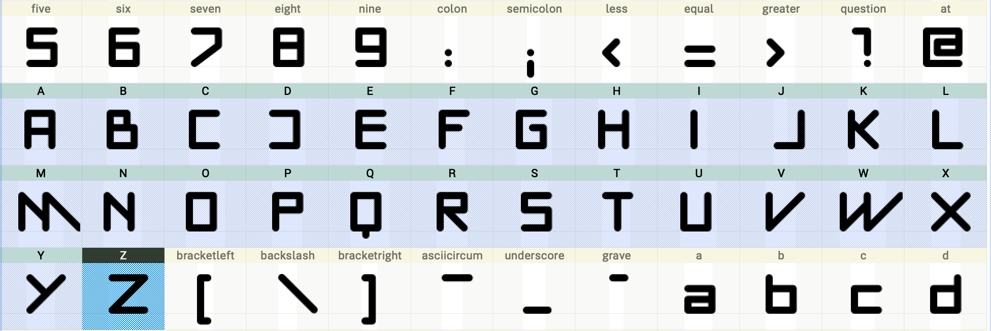 Après avoir cliqué sur OK, un nouveau glyphe est créé dans la fenêtre Font. Il faut en modifier le contenu pour en adapter le dessin. Les nouveaux glyphes, en plus des 256 existants, s’affichent avec une barre supérieure de nom sur fond blanc, alors que les 256 glyphes de base ont un nom sur fond jaune.