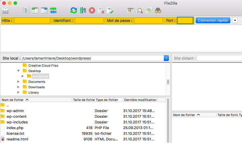 Lancez FileZilla, paramétrez une connexion avec vos identifiants FTP (hôte, identifiant et mot de passe, transmis par votre hébergeur), en remplissant les champs en jaune ci-dessous.