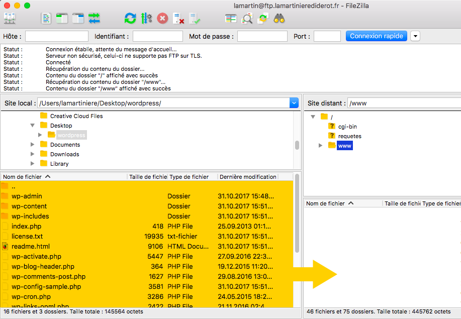 Copiez ensuite LE CONTENU de votre dossier WordPress ( PAS le dossier lui-même) dans le dossier principal de votre hébergement (souvent nommé www ou web). Sélectionnez tout le contenu affiché en jaune ci-dessous et faites-le glisser à droite. Repérez bien les dossiers sélectionnés correspondant, wordpress en haut à gauche, www en haut à droite.