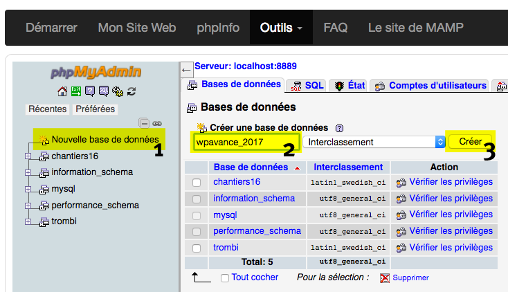 2_ En haut dans la partie droite, dans la case « Créer une base de données (create database) » saisir un nom. Le nom par défaut est « wordpress » mais si vous souhaitez créer plusieurs bases pour des tests, vous pouvez utiliser un nom plus approprié (« wordpress1 » par exemple, ou wpini_2023 ou encore wp_prenom en personnalisant votre prénom). Utilisez des bas de casse exclusivement, sans espace et sans signe particulier, ni ponctuation, ni accents, etc. Seuls les tirets sont autorisés.