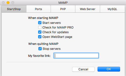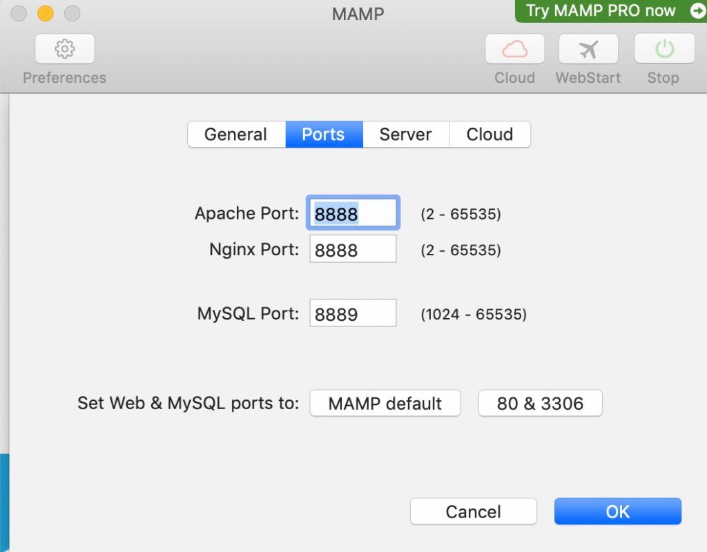 À ce stade, si MAMP refuse de démarrer les serveurs (les deux boutons ne sont pas au vert), notamment sur Windows, essayez d’abord de changer les ports dans les préférences de MAMP. Vérifiez également que les ports 8888&8889, ou 80 sont bien ouverts sur votre ordinateur et ne sont pas utilisés à autre chose.