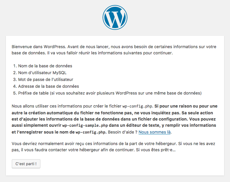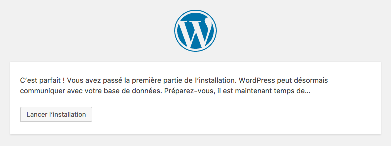 Le paramétrage de WordPress va se dérouler en deux étapes, lier WordPress à la base de données que l’on vient de créer, puis paramétrer le compte administrateur de WordPress, c’est-à-dire votre propre accès à la gestion de votre site WordPress.