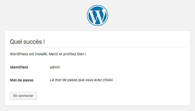 Il vous est demandé un identifiant et un mot de passe, différents de ceux utilisés précédemment. C’est ceux que vous utiliserez couramment pour vous connecter à votre Tableau de Bord de WP. Vous pourrez laisser votre navigateur le mémoriser.