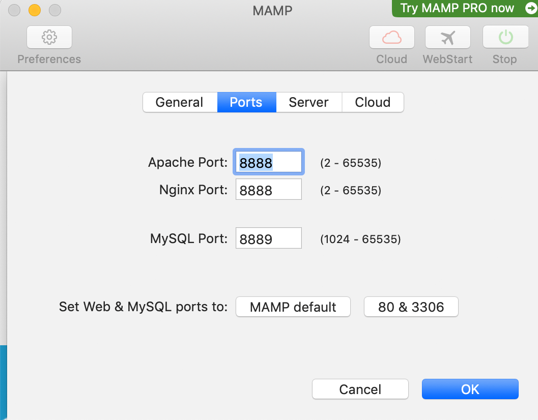 Il est également recommandé de paramétrer le port par lequel MAMP va dialoguer avec la base de données.