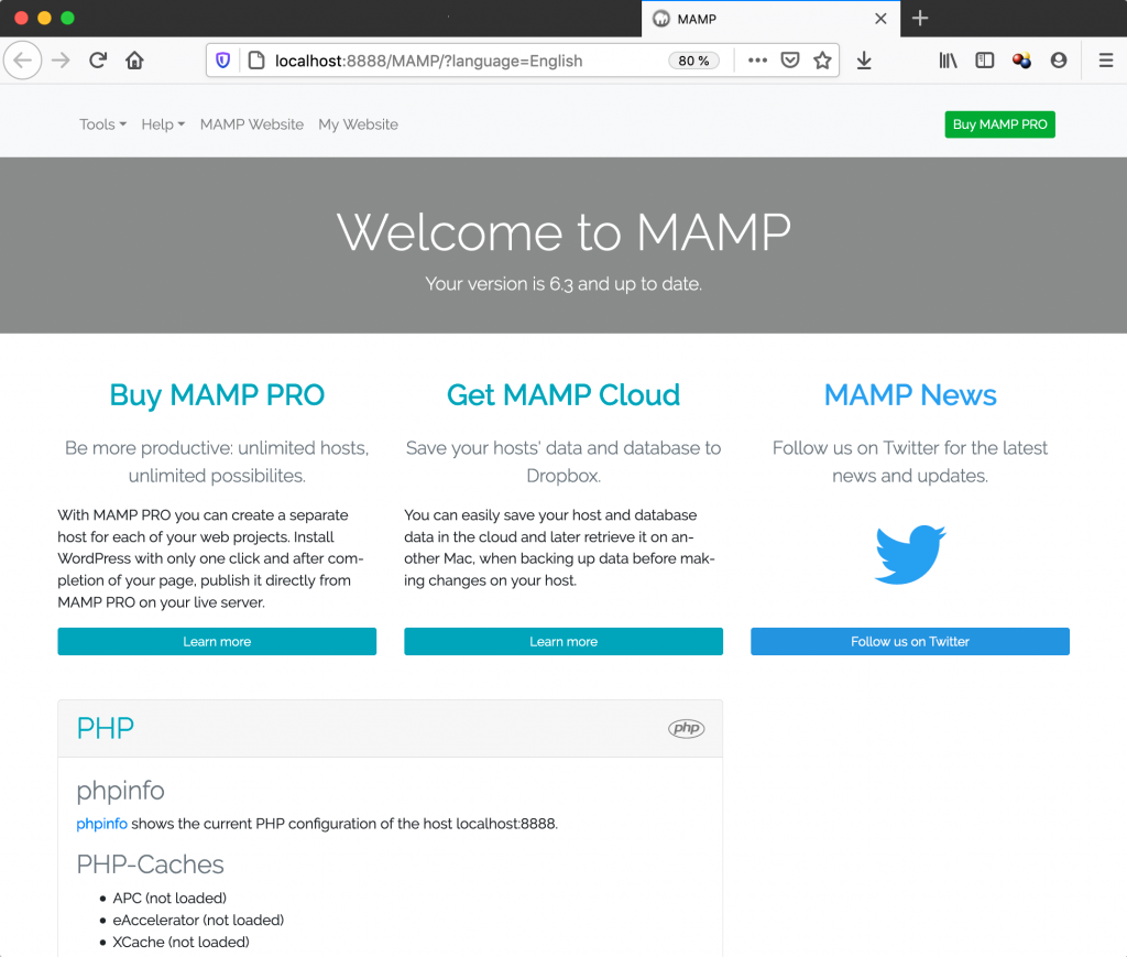 La page d’accueil de MAMP s’ouvre dans un navigateur. Si ce n’est pas le cas, cliquez sur le bouton en forme d’avion, WebStart. La page ci-dessous doit s’ouvrir.