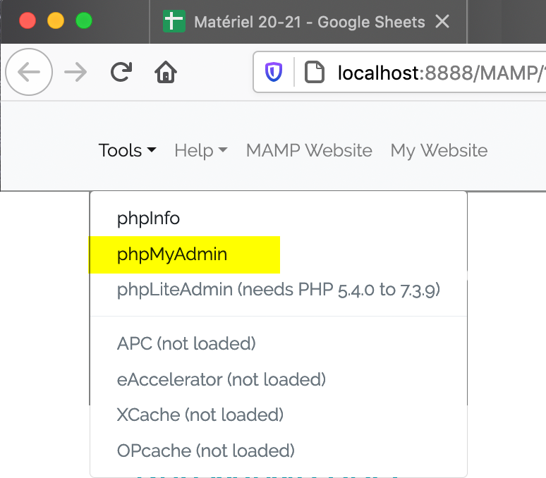 Dans la page d’accueil de MAMP, dans le navigateur, cliquer sur le lien « phpMyAdmin » du menu TOOLS.