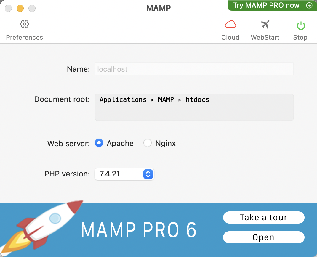 Dans le fenêtre de MAMP, cliquez sur « Webstart » en haut à droite, ce qui lancera une fenêtre dans votre navigateur, si ne n’est pas déjà fait au démarrage de MAMP.