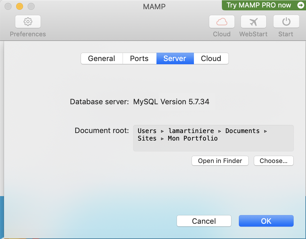 Il faut à présent indiquer à MAMP où se trouve ce dossier. Allez dans le Menu Mamp > Preferences… puis dans l’onglet « Server » cliquez sur le bouton « Choose… » et choisissez le chemin vers votre dossier racine (Document root) « Mon Portfolio ». (voir ci-dessous).