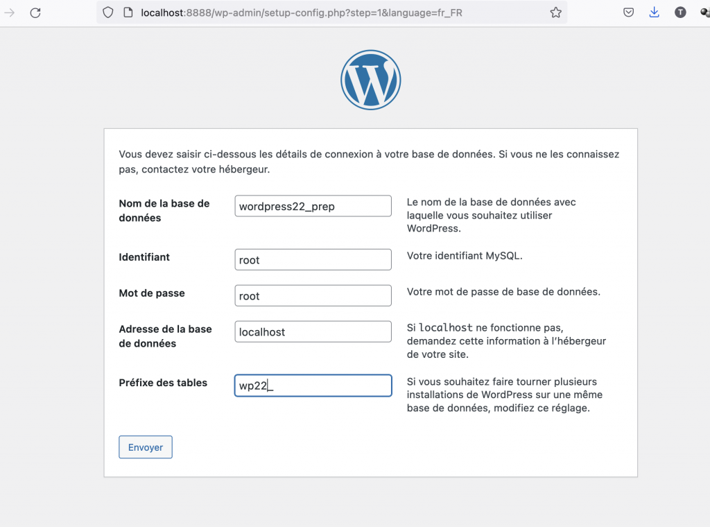 Indiquez dans la première case le nom de la base de données choisi précédemment (par exemple « wordpress1 » ou « wp_prenom »). Dans les zones login & mot de passe, indiquez « root » & « root ».