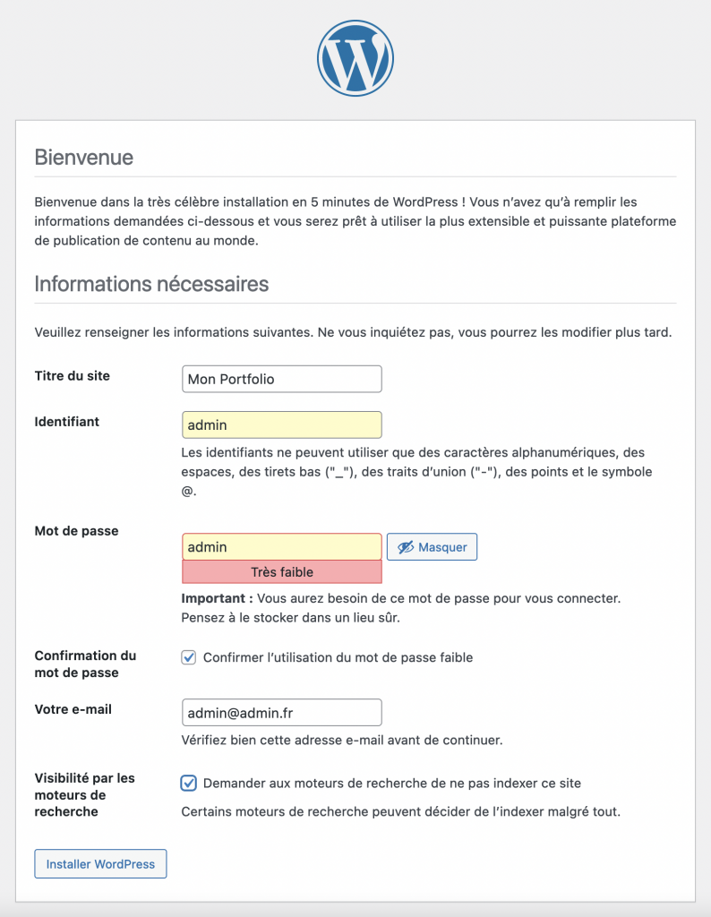En local, simplifiez-vous la vie en choisissant comme login et mot de passe, « admin » & « admin ». Puisque dans ce cas le mot de passe est trop simple, vous devrez cocher la case « Confirmer l’utilisation de mot de passe faible« . Vous devez également indiquer un mail. En local, un faux mail fera l’affaire. Je vous recommande admin@admin.fr (ou moi@moi.fr comme plus bas).