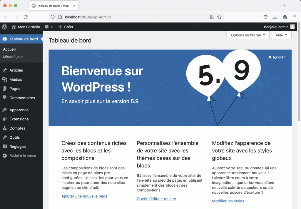 Il est également possible d’accéder au DashBoard (Tableau de Bord) en ajoutant à l’URL de votre home page de WP :
