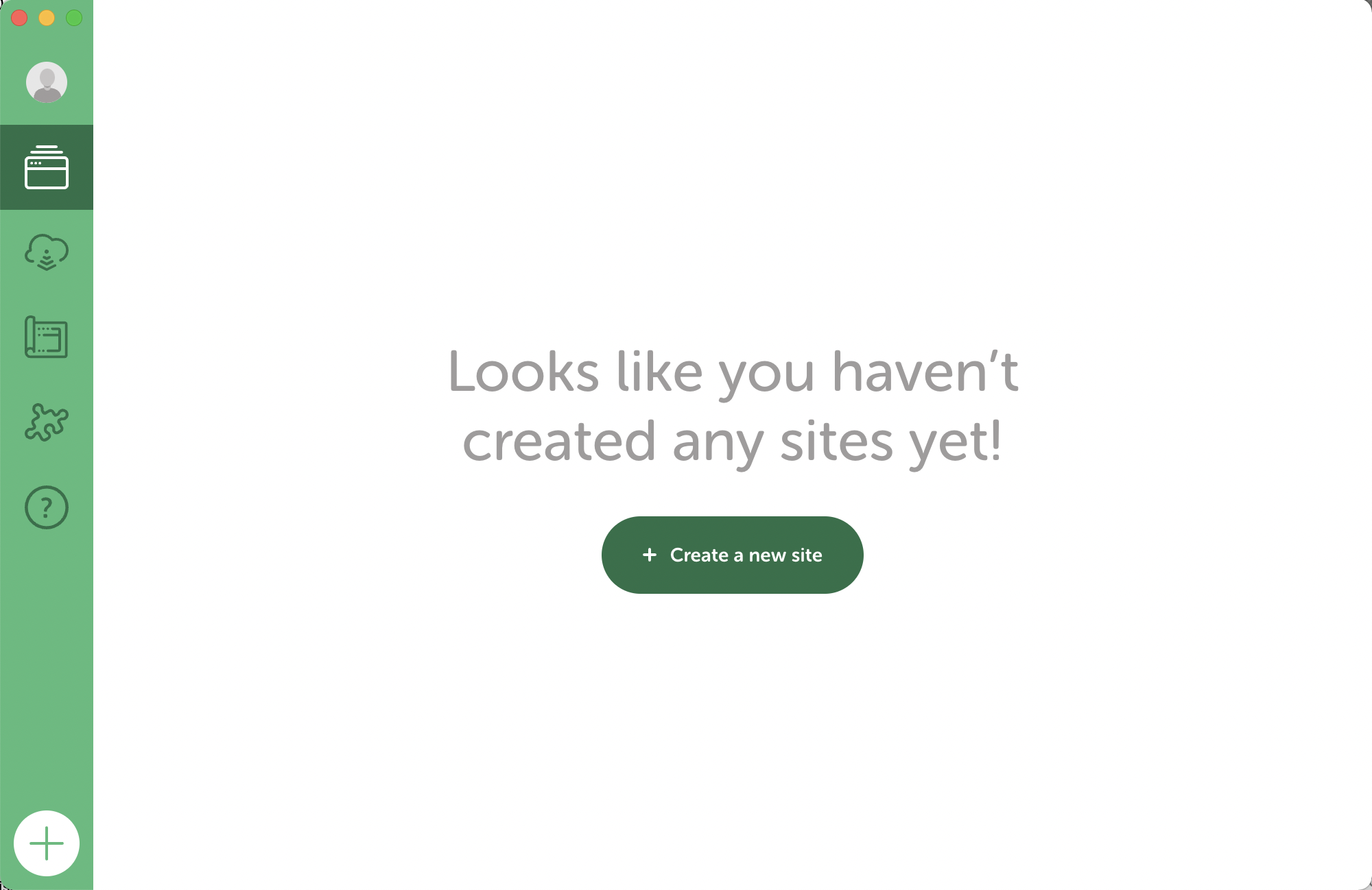 Pour l’instant, la seule chose à faire est de créer un nouveau Site. Cliquer sur le bouton Create a new site au centre, ou sur le bouton + en bas de la barre verte à gauche.