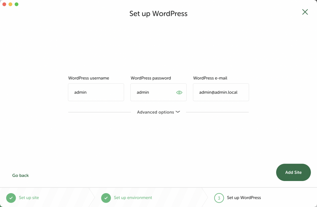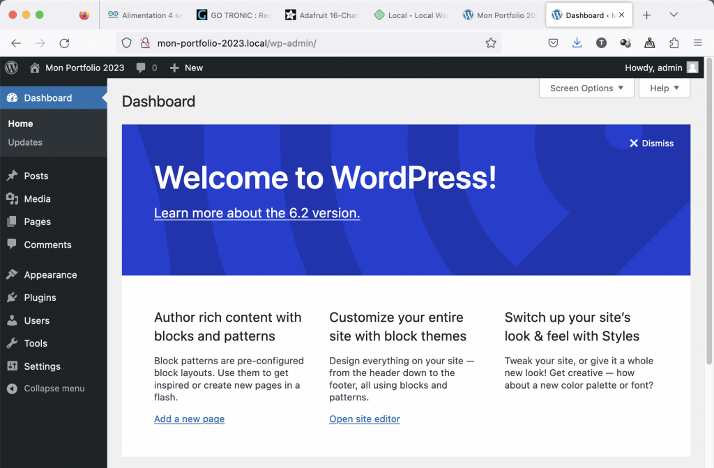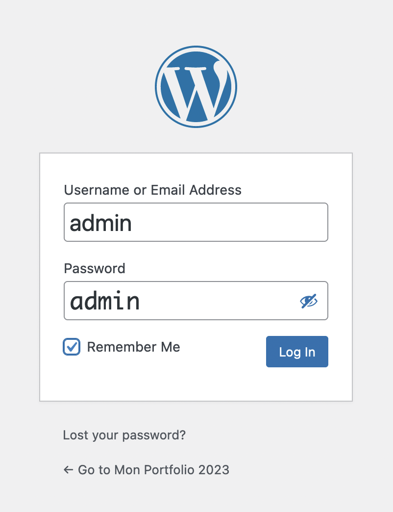 Toujours depuis l’écran d’accueil de Local, cliquer sur le bouton WP Admin vous demandera de vous loguer à votre zone d’administration, autrement nommée le Tableau de Bord ou DashBoard.
