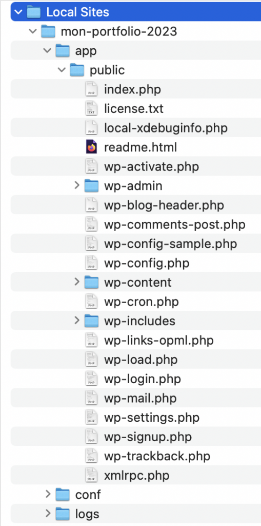 Vous serez menés vers un dossier Local Sites, au premier niveau de votre ordinateur, qui contient tous vos sites locaux.