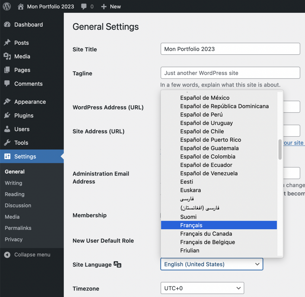 Vers le bas, trouver le réglage Site Language, déroulez le Menu et choisir Français. N’oubliez par de valider ce choix en cliquant sur le bouton bleu Save Changes, tout en bas.