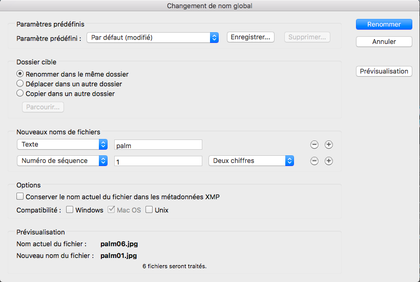 Suivre les étapes de la fenêtre ci-dessous. Voir le résultat en bas de la fenêtre dans la zone Prévisualisation. Cliquer sur Renommer.
