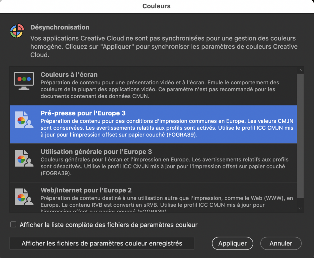 Dans la fenêtre, cliquer sur le réglage « Prepresse pour l’Europe 3 » C’est le meilleur réglage adapté à la PAO.