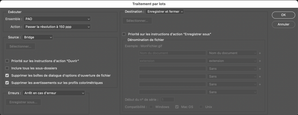 En bas à gauche, cocher les deux cases « Supprimer… » pour éviter de bloquer l’exécution de l’action s’il y a des alertes de colorimétrie à l’ouverture automatique des images par Photoshop.