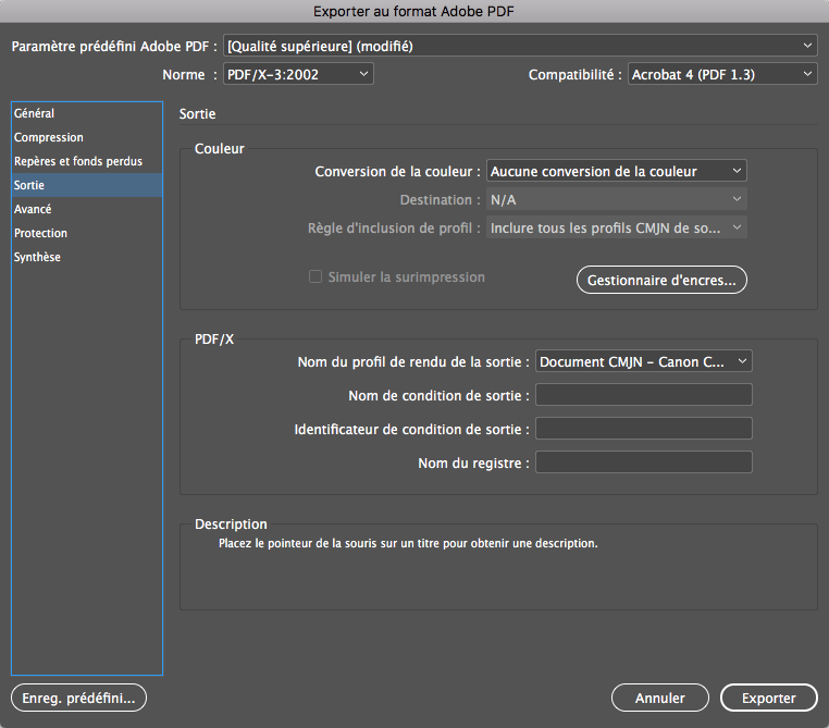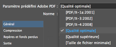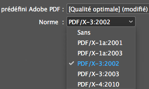 1. Choisissez une Norme. La norme PDF/X-3:2002 est ancienne mais elle vous garantira que les erreurs d’accents (caractères accentués remplacés par des rectangles vides) ou de transparences, seront réglées à l’impression.