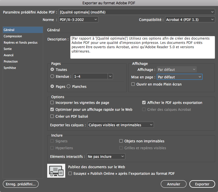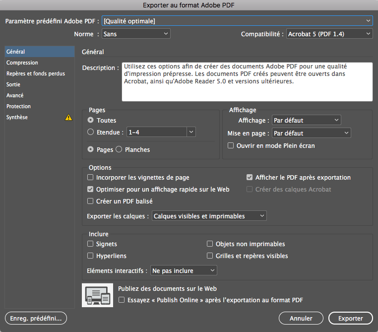 3. Ne modifiez pas les Options. Cochez les deux cases « Optimiser pour un affichage rapide sur le web » et « Afficher le PDF après exportation ». Parfois la case « Créer un PDF balisé » est coché. C’est inutile ici.