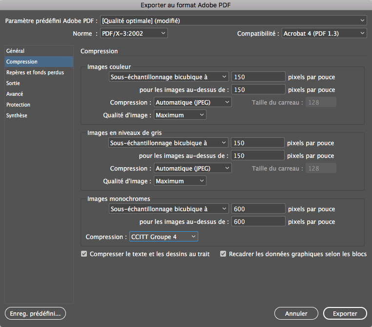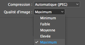 Pour la compression, gardez « Automatique (JPEG) » avec une valeur de Qualité d’image à « Maximum » de préférence, ou « Élevée » si vous devez gagner un peu de poids de fichier.