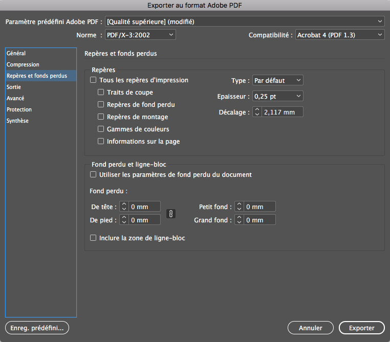 Vous pouvez garder l’ensemble des réglages désactivés, sachant que si vous en avez besoin, vous pourrez cocher les Traits de coupe (seulement les traits de coupe et aucun autre repère) et/ou le Fond perdu « Utiliser les paramètres de fond perdu… ».