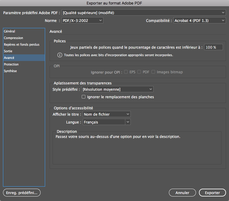 Il faut adapter le réglage d’aplatissement des transparences à la résolution des images. Pour une impression standard, les images étant à 150 dpi, l’aplatissement doit être en « Résolution moyenne ».