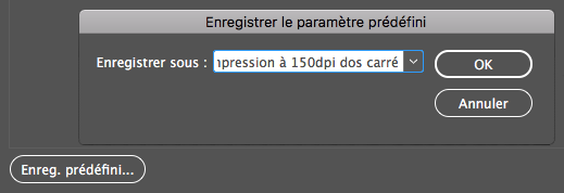 Cliquez sur le bouton Enreg. prédéfini… en bas à gauche de la fenêtre. Choisissez un nom à votre Paramètre. Soyez explicite. Ici, je vous propose : « Impression à 150 dpi dos carré RVB ». Puis validez par OK.